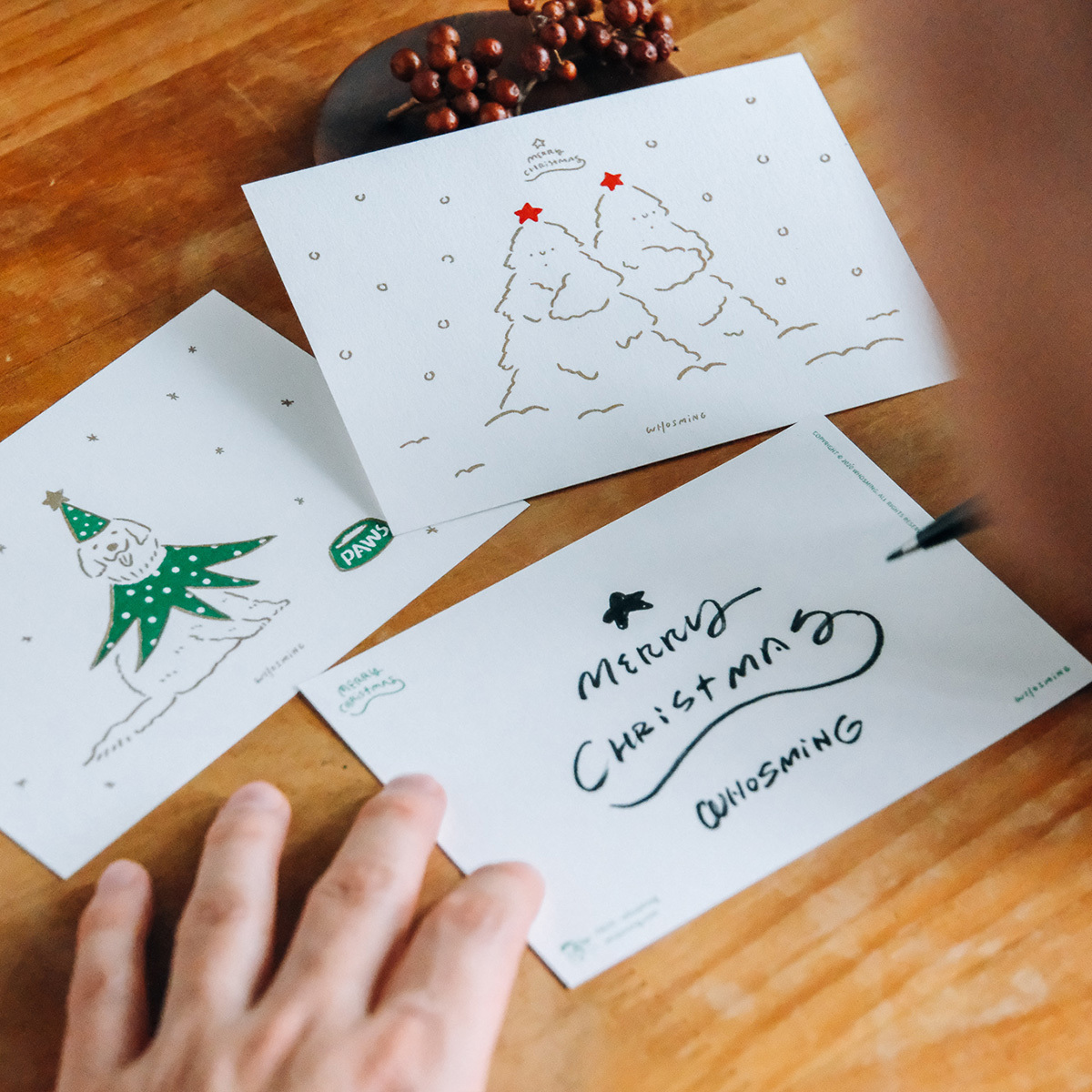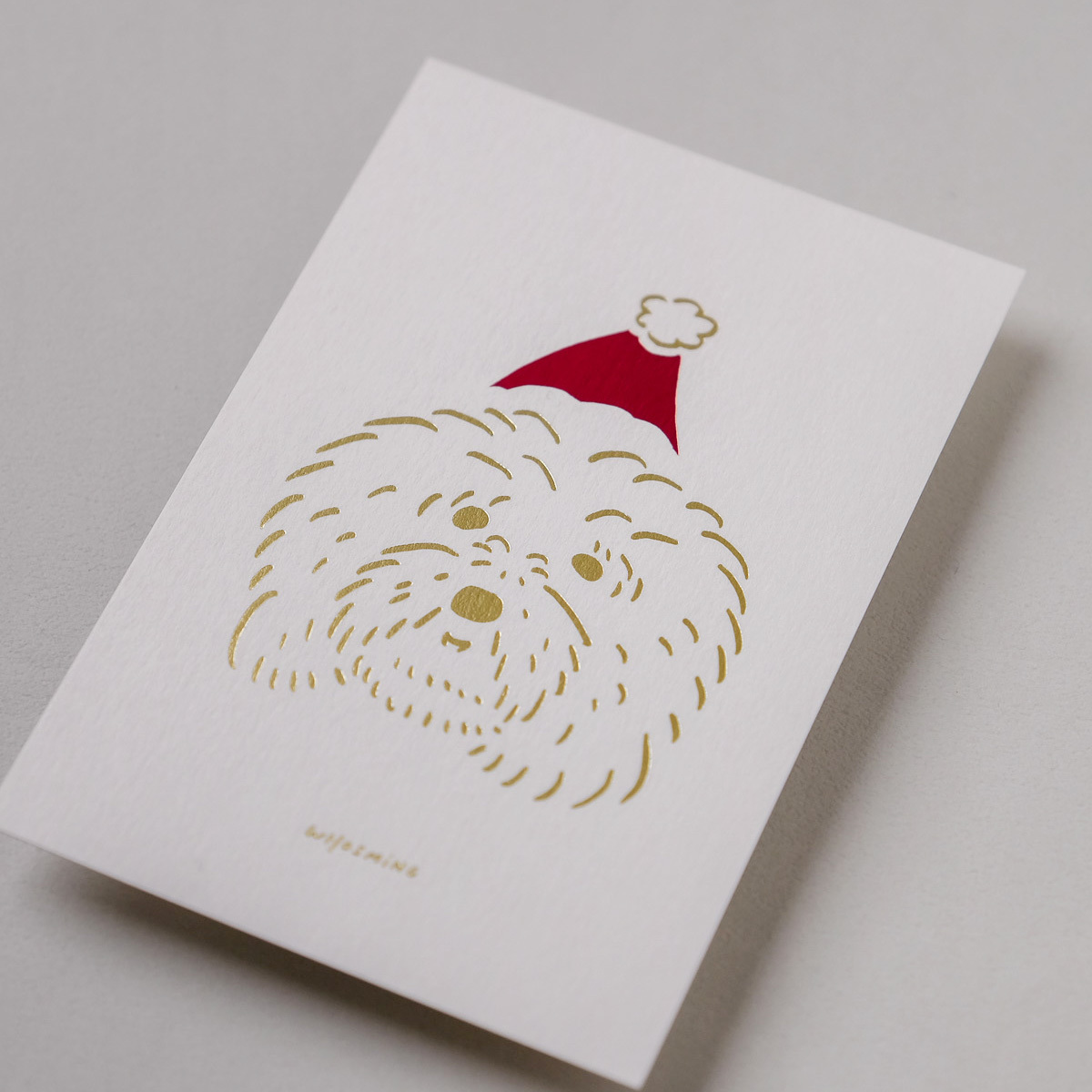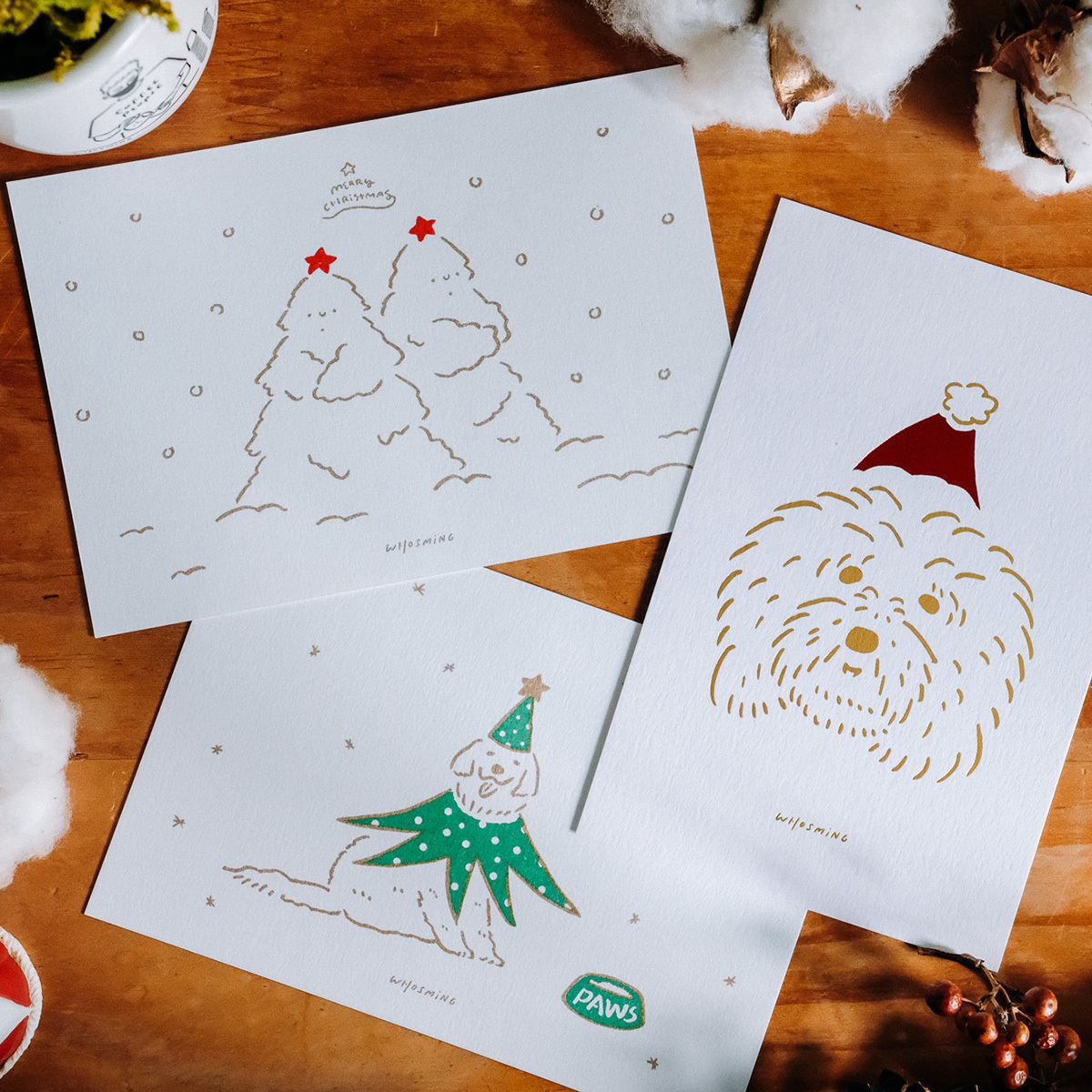 以聖誕節與可愛狗勾為主題繪製的節慶卡片。雙面燙金加工,搭配來自英國厚磅數進口紙,背面有完整空間可供書寫與黏貼郵票。