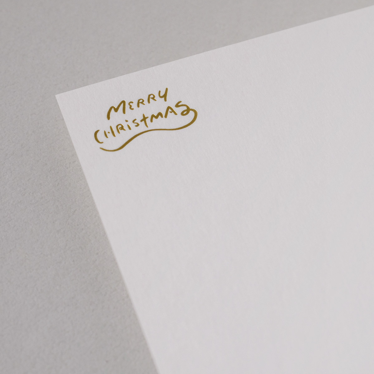 獨特的孔版印刷技術,選用特殊的金色油墨,每件印製都是獨一無二的呈現,搭配厚磅數的日本進口紙。背面有完整空間可供書寫與黏貼郵票,不管用水性還是油性的簽字筆在霜白紙上書寫都不易透到正面。