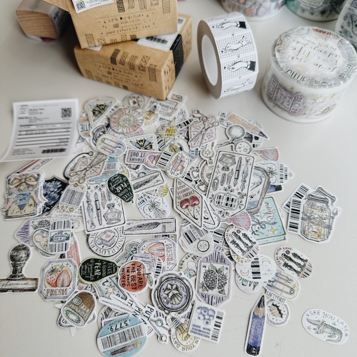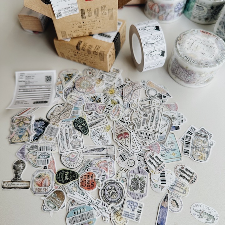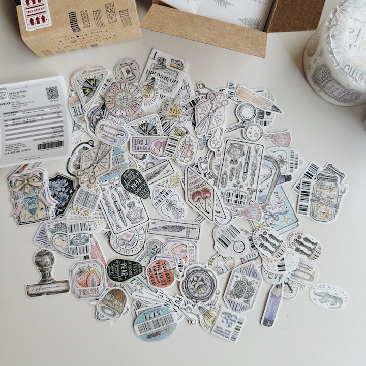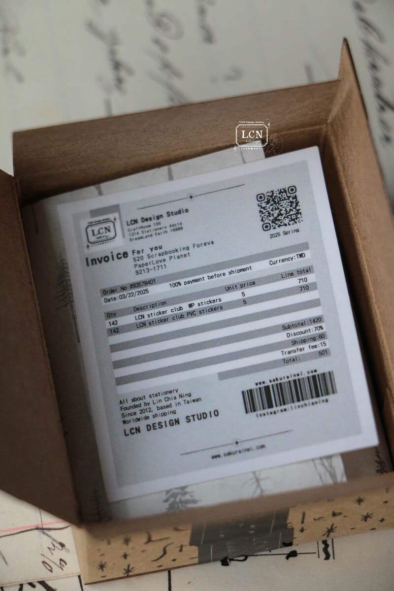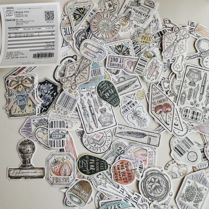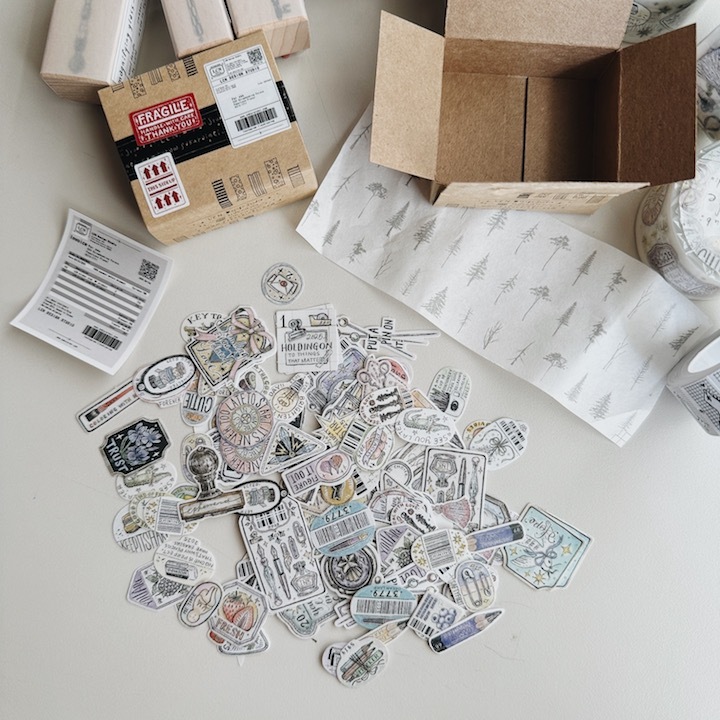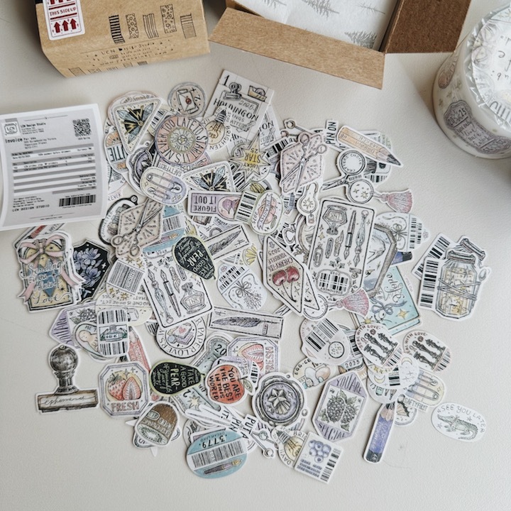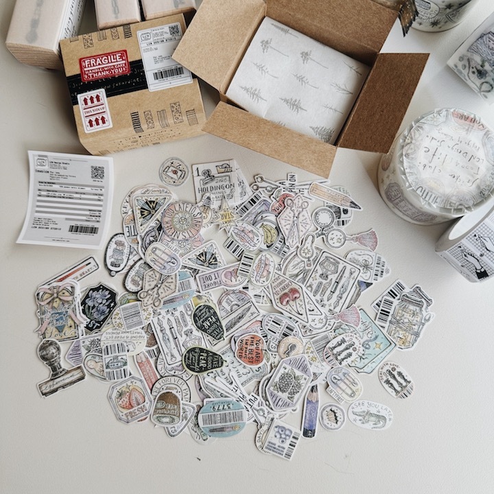 什麼都有喔,有易碎品貼紙、寄送標籤,還有發票明細,