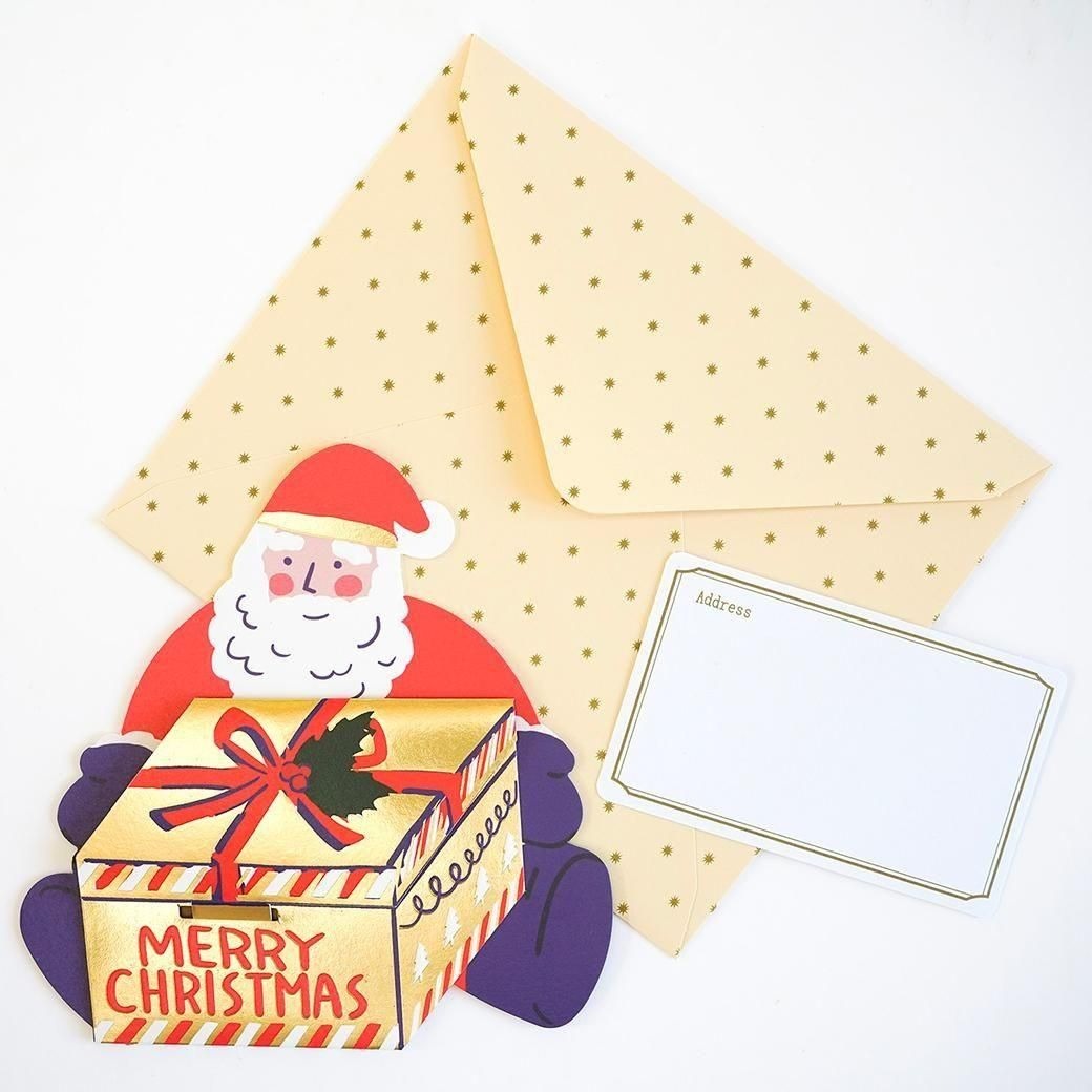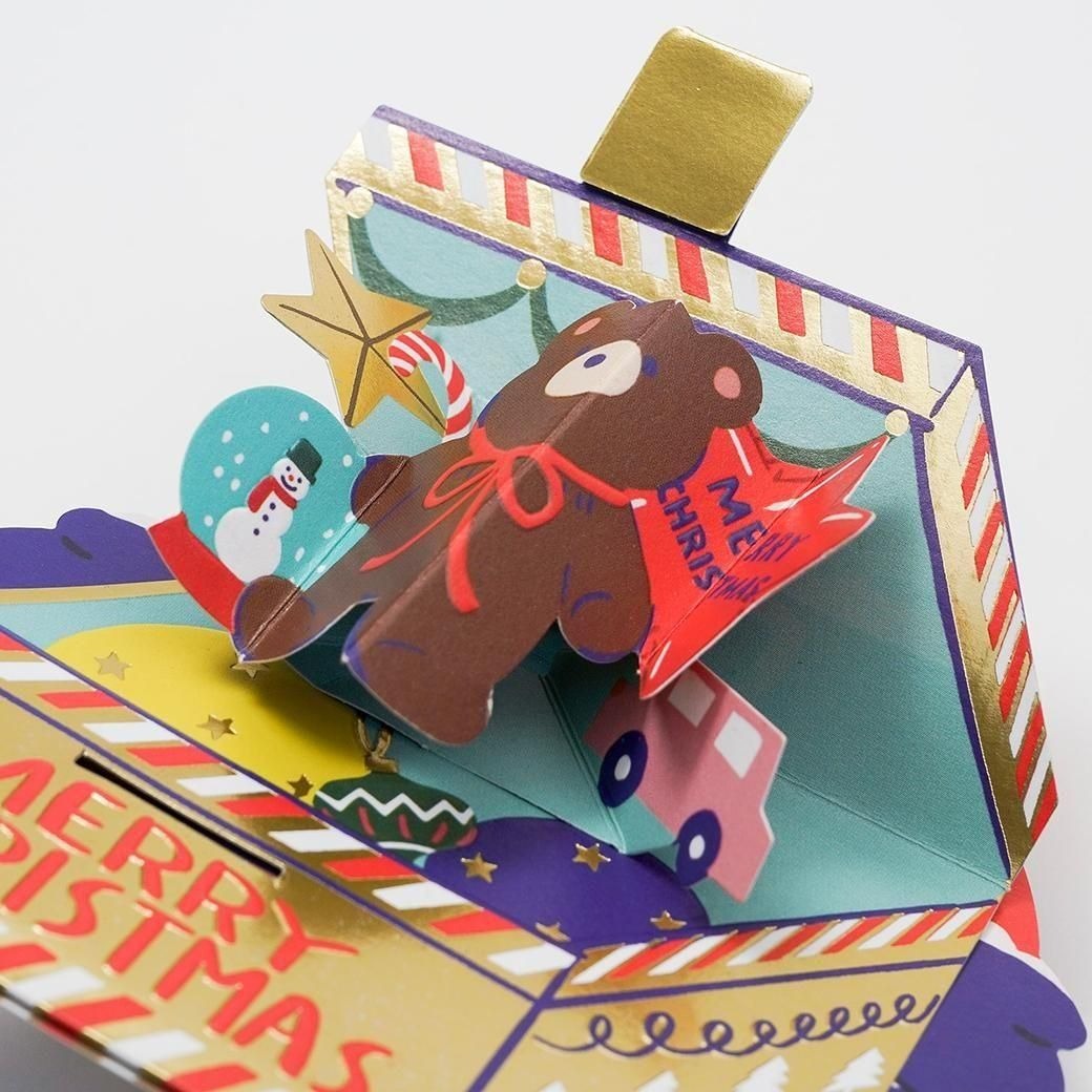 打開包裝盒時,卡片上的禮物會彈出。賀卡採用低光金箔燙金處理。