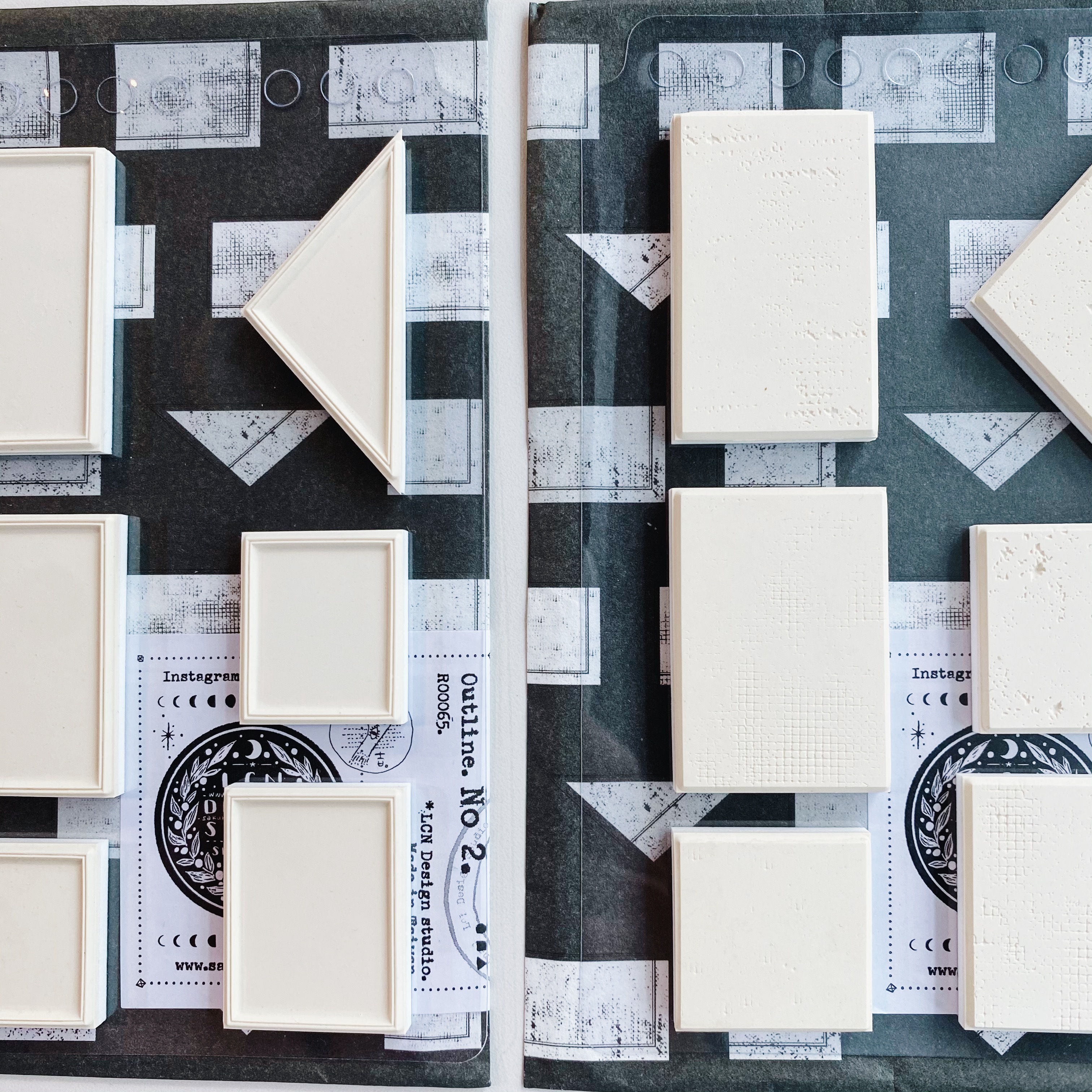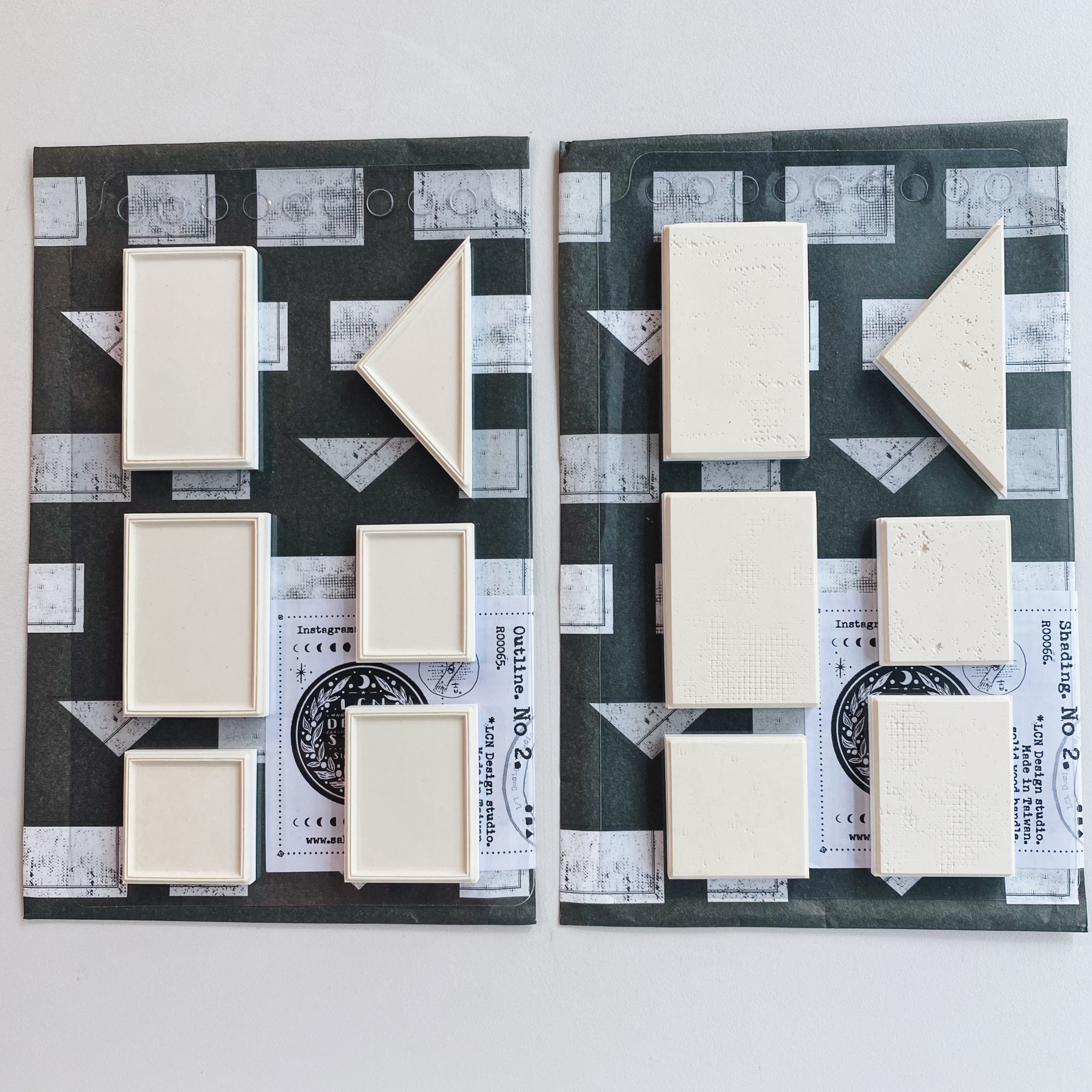 背膠如因髒污導致黏性下降時,使用清水擦拭即可恢復正常。自黏草皮章搭配水晶壓克力塊能夠在蓋印時更清楚地對位。這些外框和底紋印章是為了郵票紙本製作的,當然也可以分開自由運用喔。