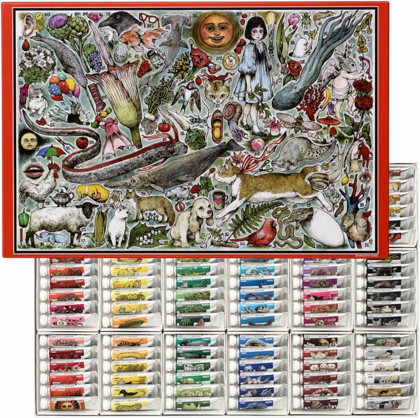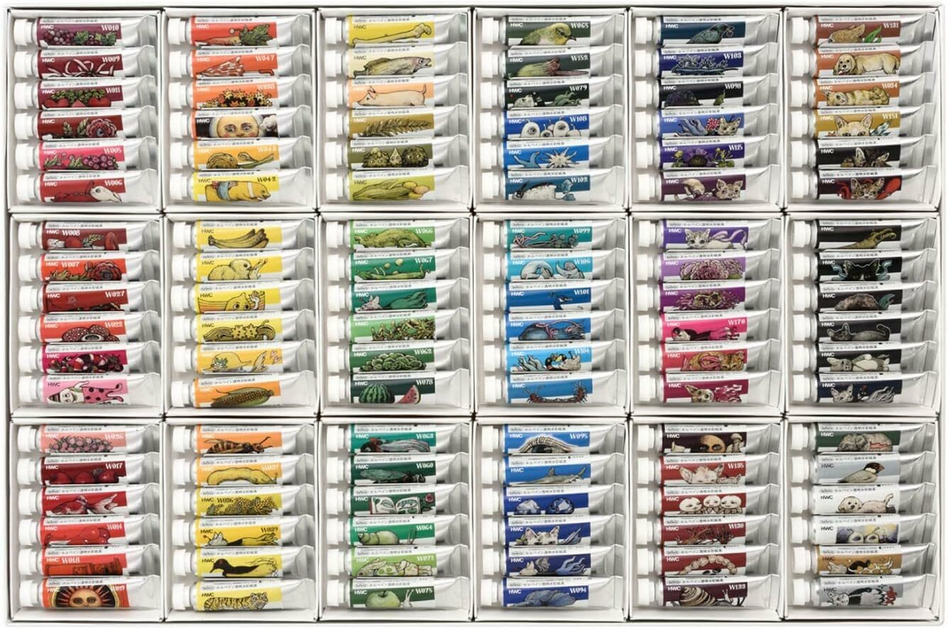 每一支水彩顏料管上都印有ヒグチユウコ設計的插畫圖案,而且108色的圖案都沒有重複!