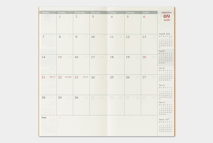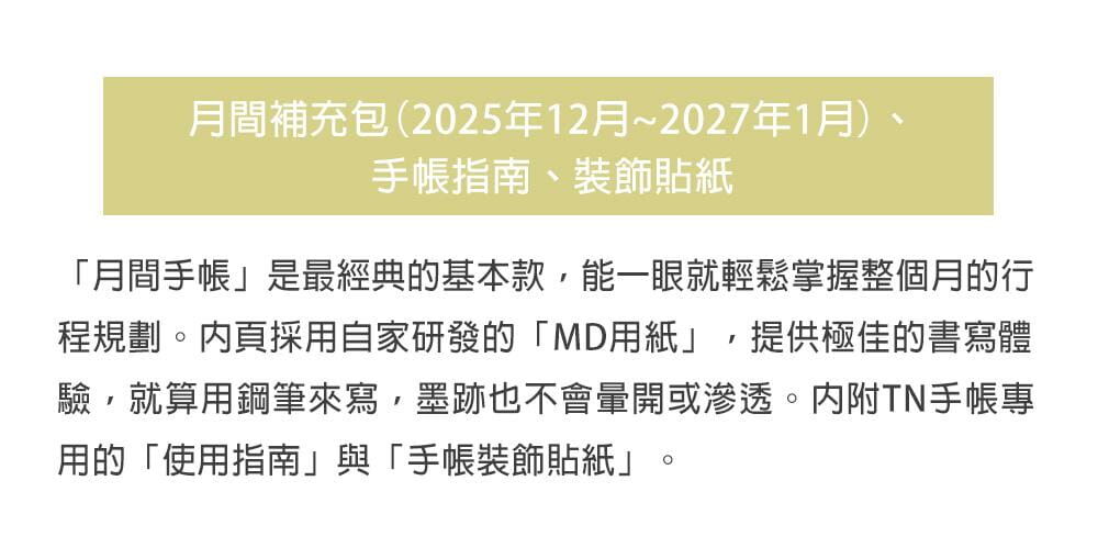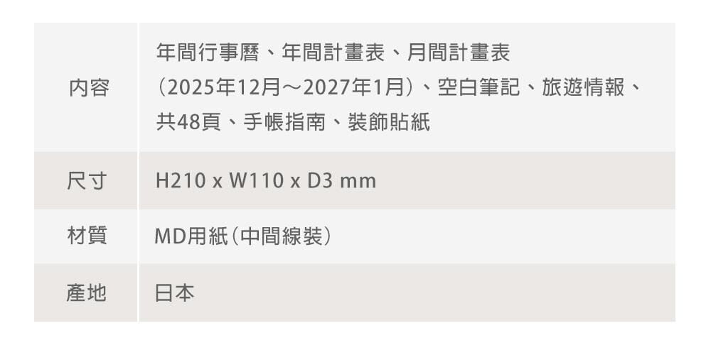 月間手帳(2025年12月-2027年1月)、空白頁、旅行情報,共48頁,採用MD用紙