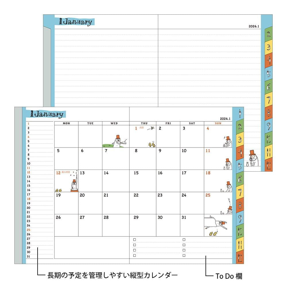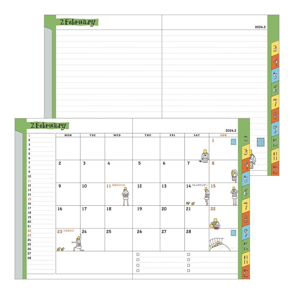 明信片大小的手帳,可充分寫下預定行程。附有方便的索引設計,在月間計畫頁面後,有跨頁筆記頁。