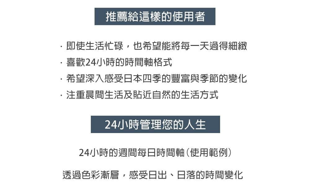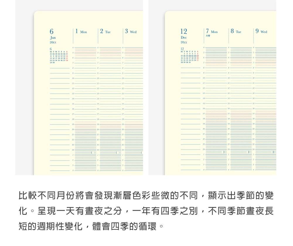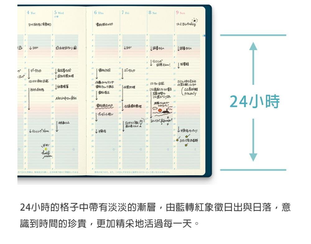 感受一天之中時間的新感覺手帳「一日之長手帳」, 24小時的格子中帶有淡淡的漸層,由藍轉紅象徵日出與日落,意識到時間的珍貴,更加精采地活過每一天。