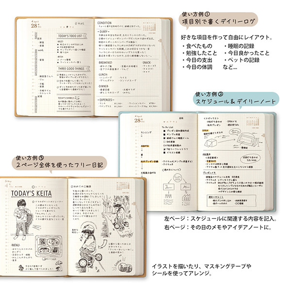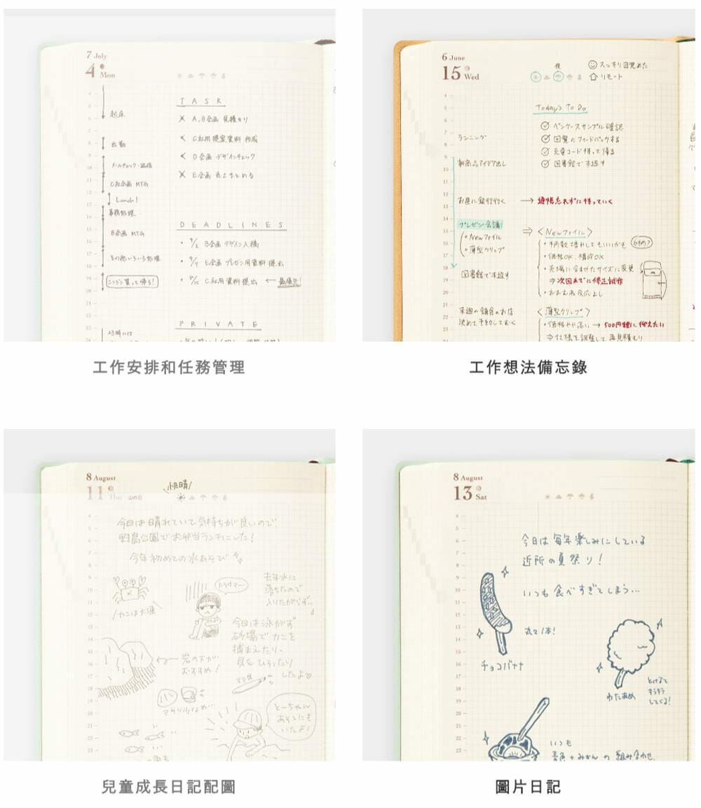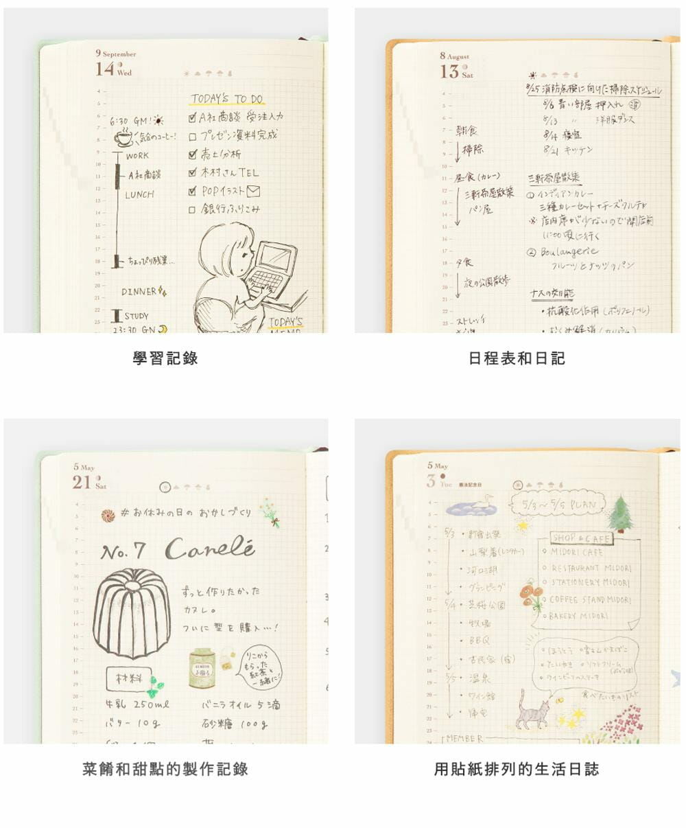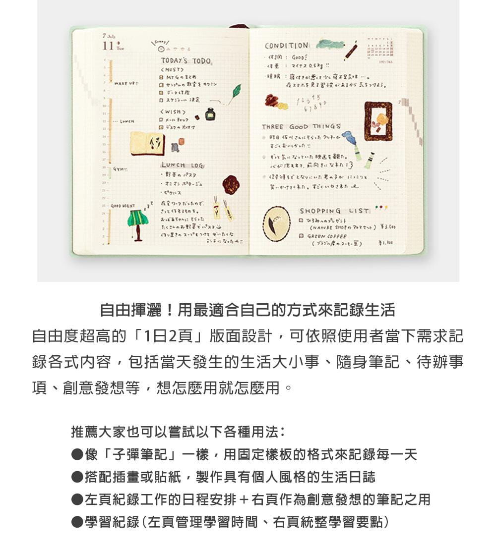 本款「1日2頁」手帳,具有充足的書寫空間,每天都有一組橫跨左右兩頁的專屬頁面,讓使用者可以盡情揮灑。