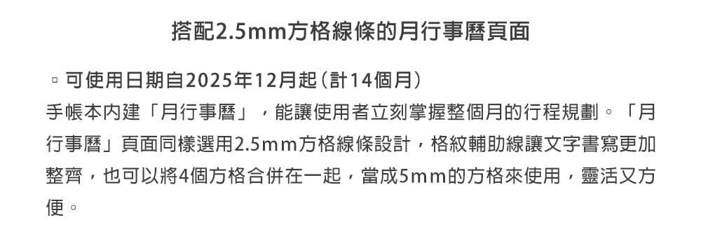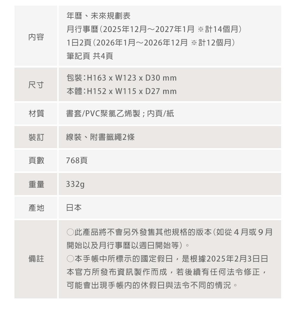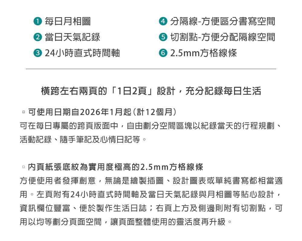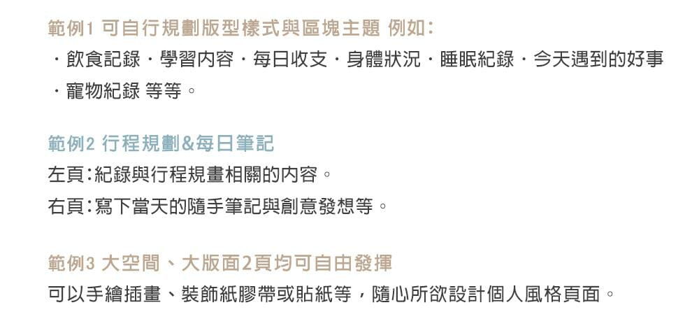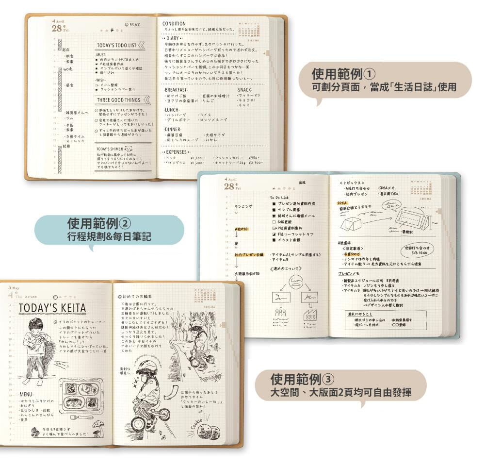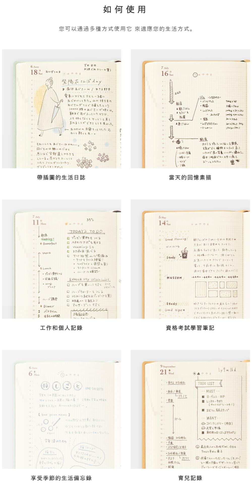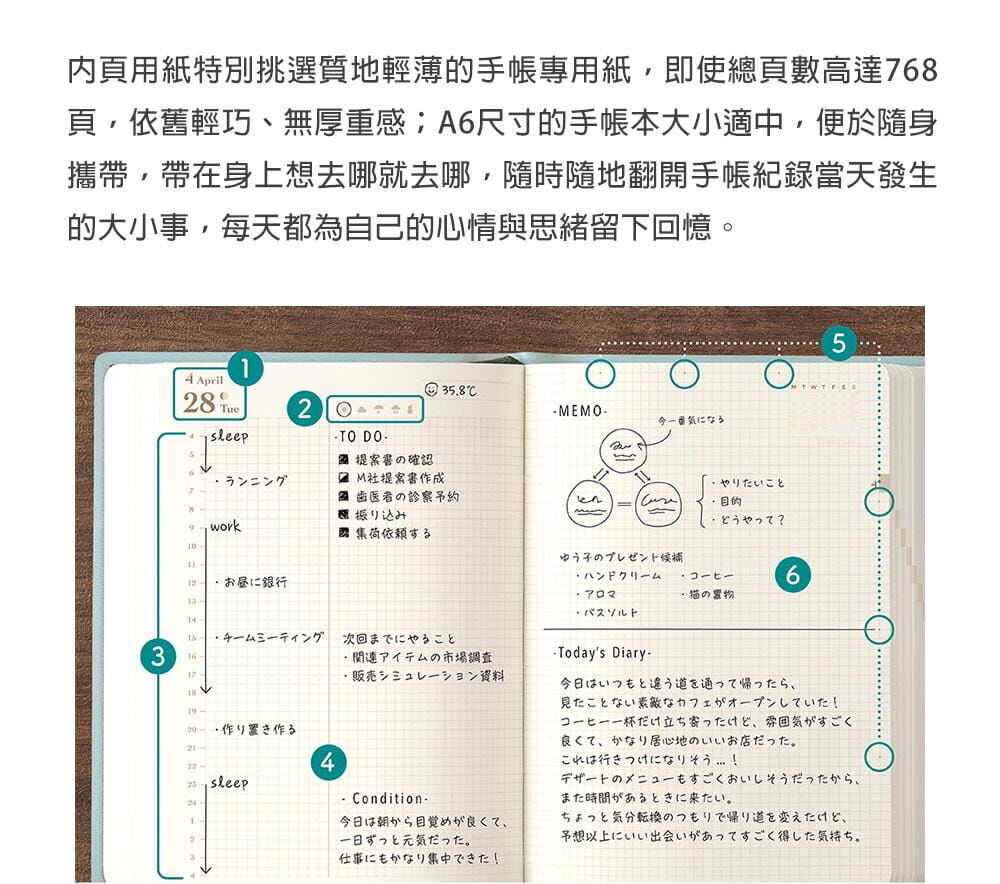 內頁用紙特別挑選質地輕薄的手帳專用紙,即使總頁數高達768頁,依舊輕巧、無厚重感;A6尺寸的手帳本大小適中,便於隨身攜帶,帶在身上想去哪就去哪,隨時隨地翻開手帳紀錄當天發生的大小事,每天都為自己的心情與思緒留下回憶。