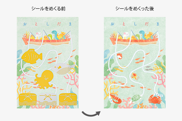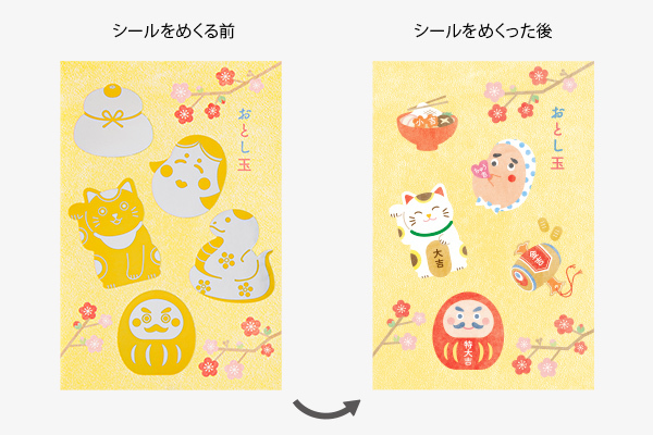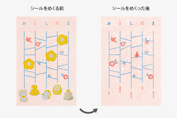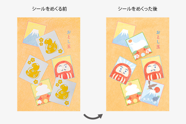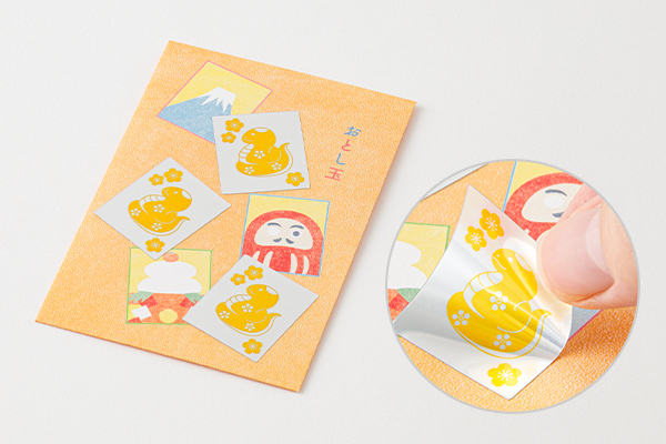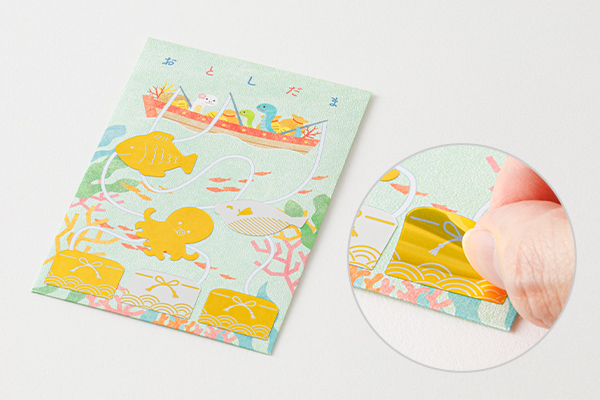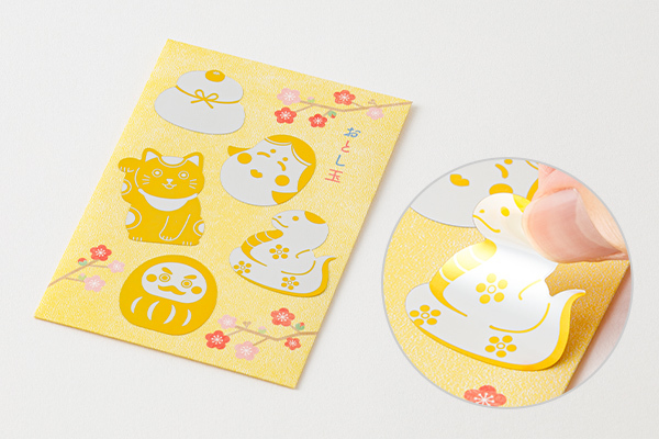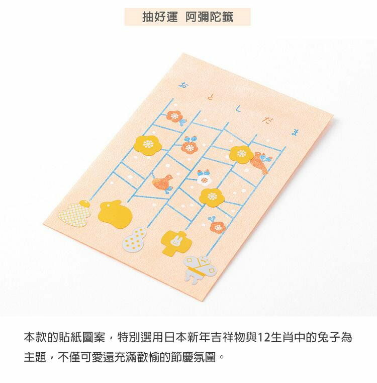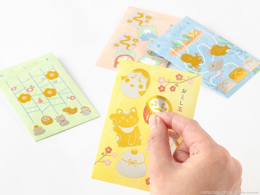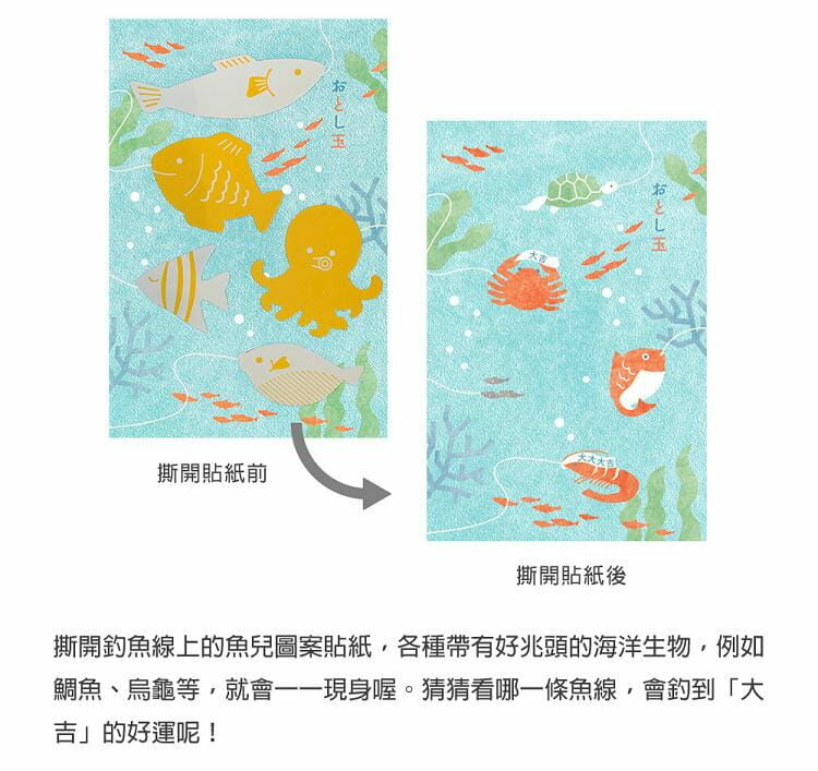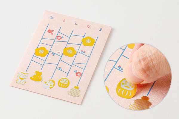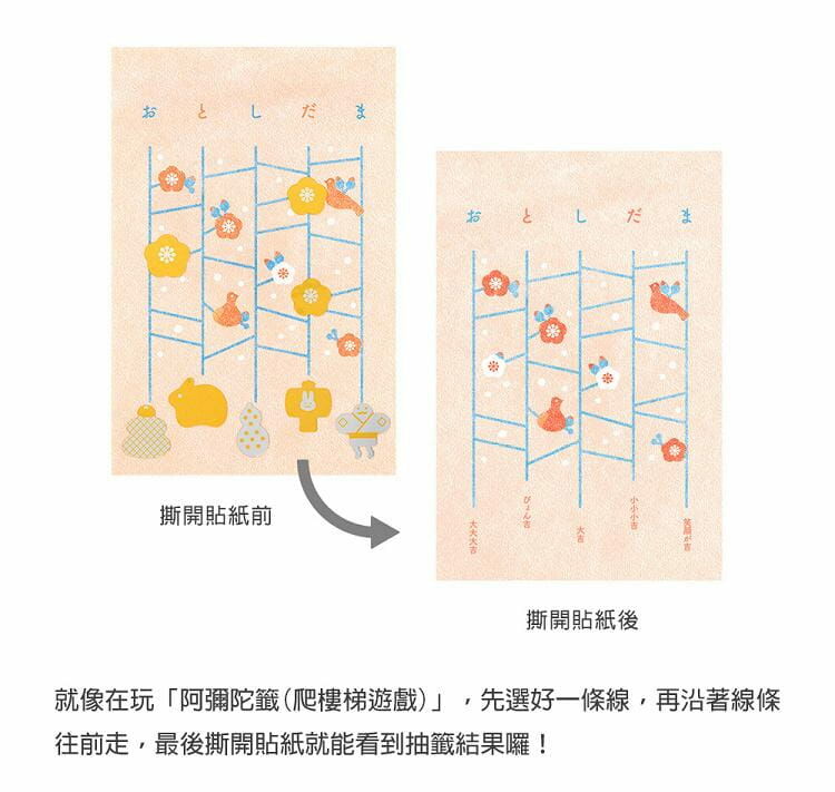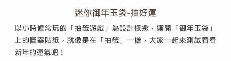 以小時候常玩的「抽籤遊戲」為設計概念,撕開「御年玉袋」上的圖案貼紙,就像是在「抽籤」一樣,大家一起來測試看看新年的運氣吧!