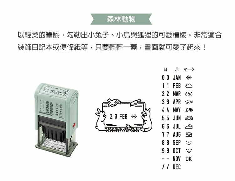 「迴轉日期印章」有可愛俏皮的圖案設計,翻轉日期章的刻板嚴肅形象。