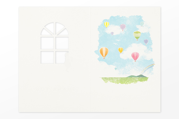 本款卡片,於卡面處以刀模設計,裁切出鏤空花窗造型,讓收件人打開卡片時,能發現窗外令人驚喜的風景。