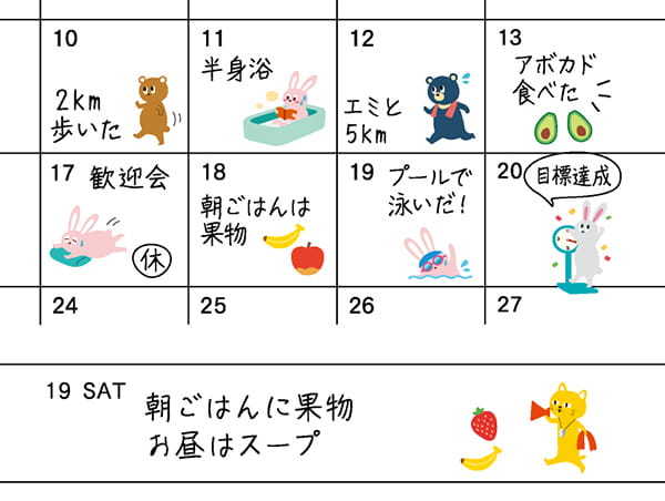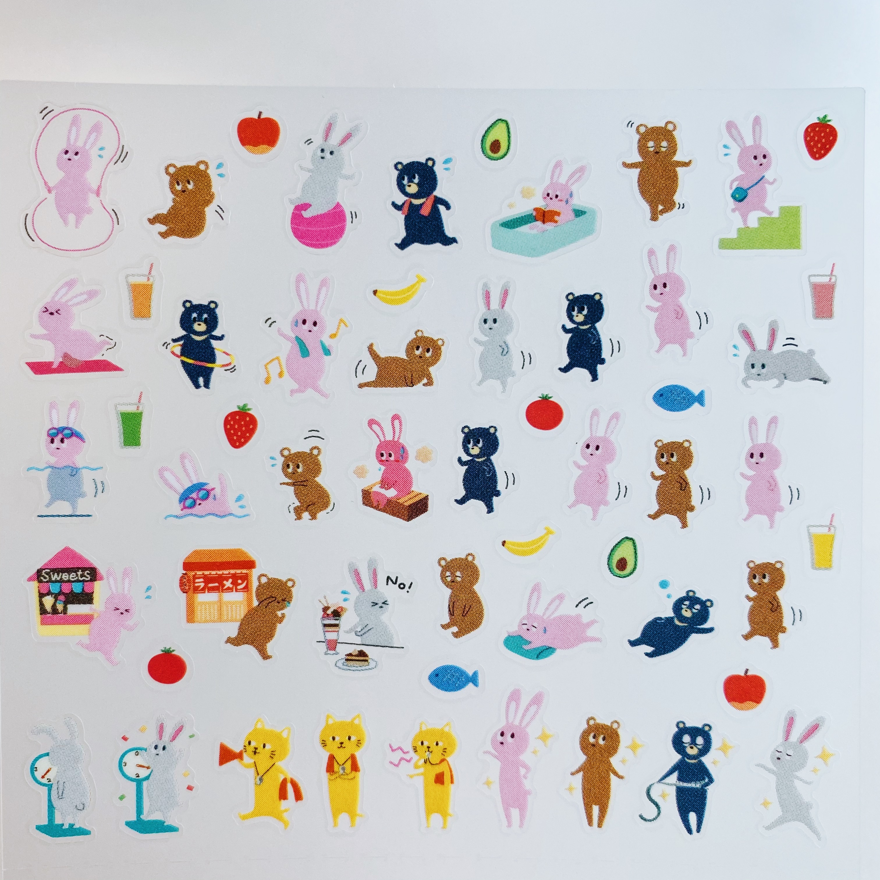 用可愛的動物們健走或跳繩,泡澡,爬梯等,支援您的瘦身計畫。無論努力時或是休息時都能夠貼上合適的可愛動物貼紙,向自己的目標努力前進。當開始覺得辛苦的時候則是貼上鼓舞的貓咪貼紙為自己加油,維持動機。