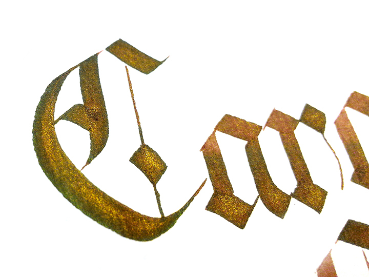 此系列墨水帶金粉,粉質細緻,可以用於鋼筆書寫,在出墨量大時亮粉能夠有優異的表現。