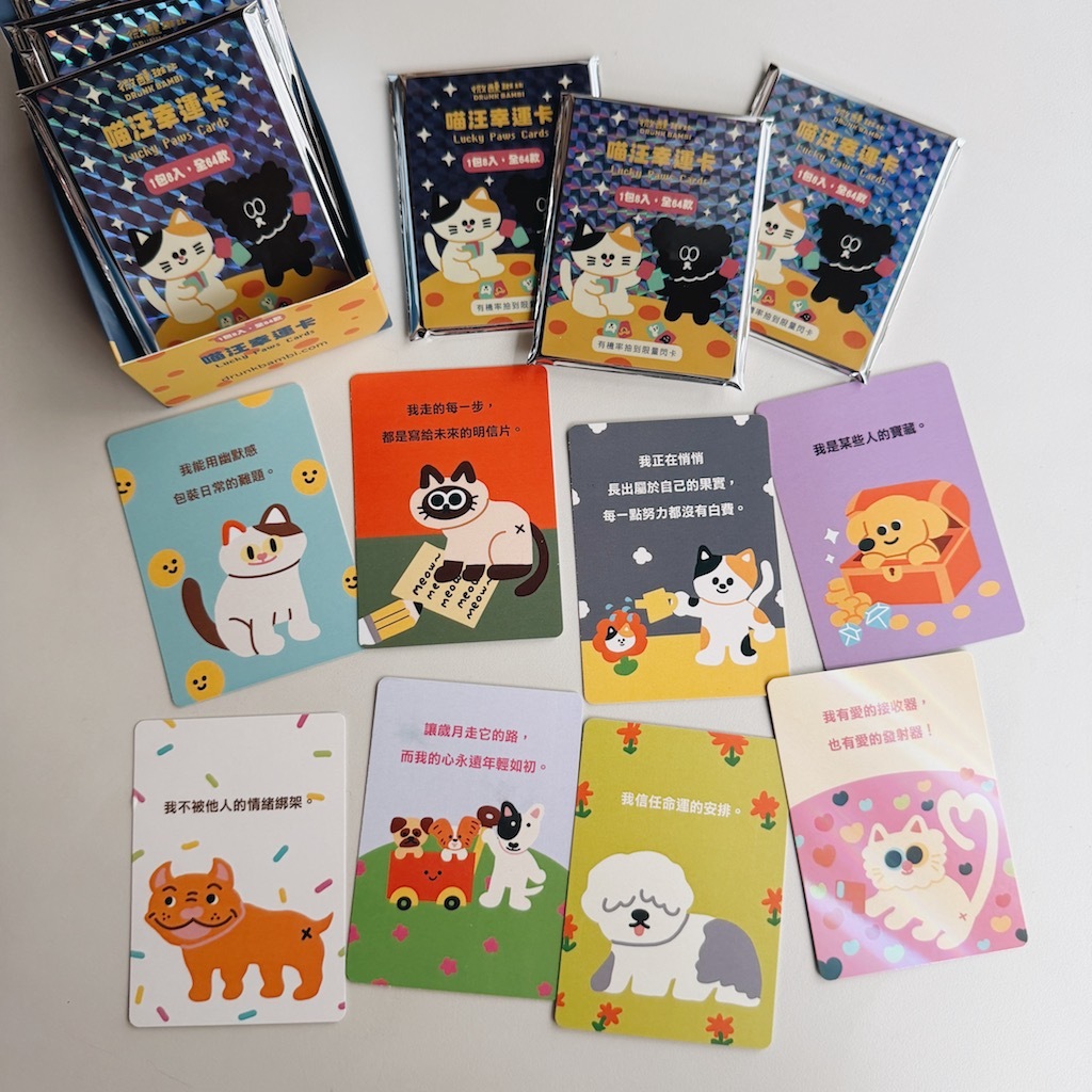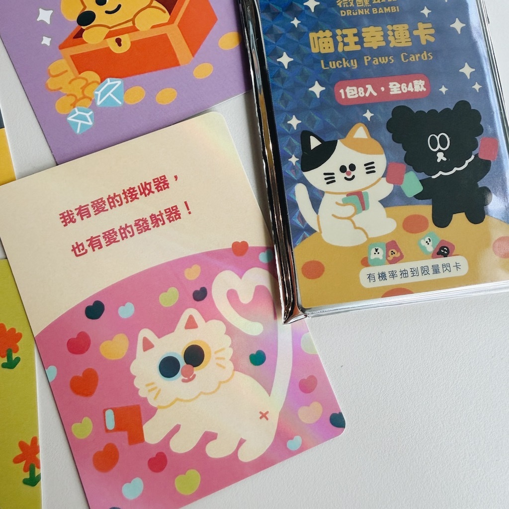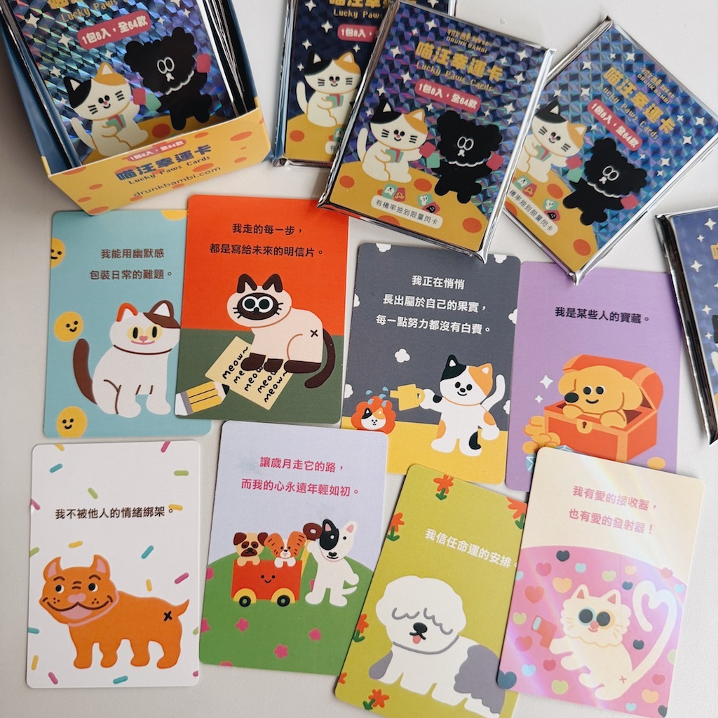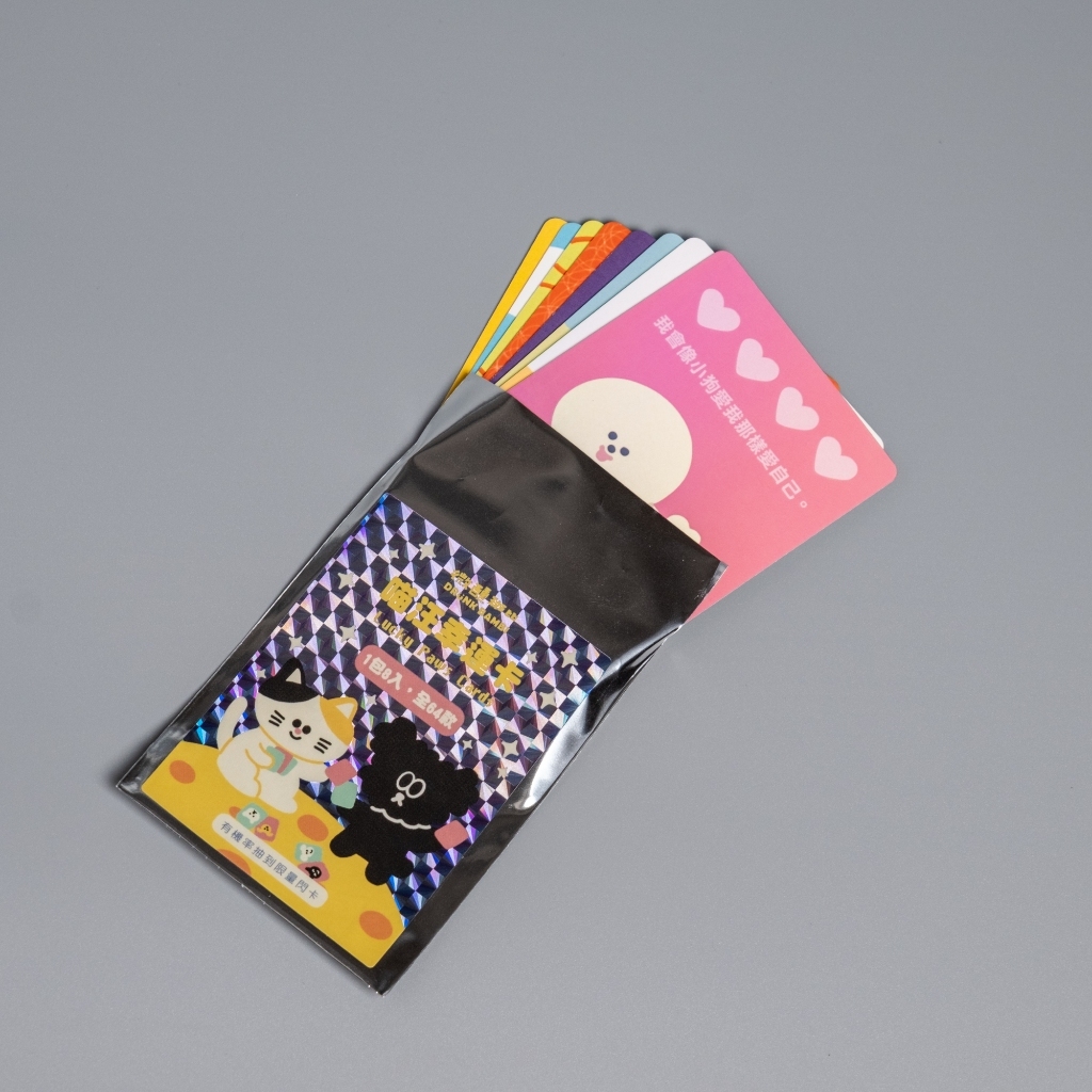 這是一組超可愛的汪喵幸運卡,總共有 64 款設計,每一張都有獨特的內容和角色,