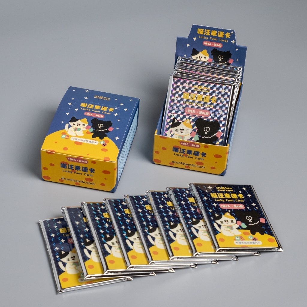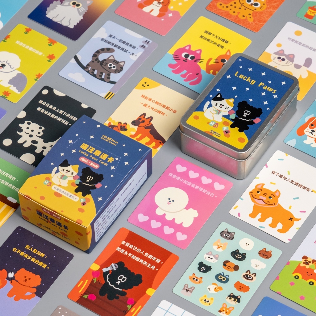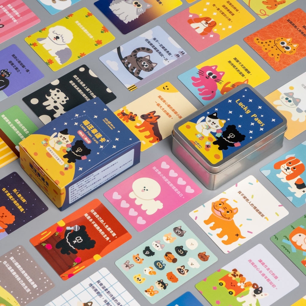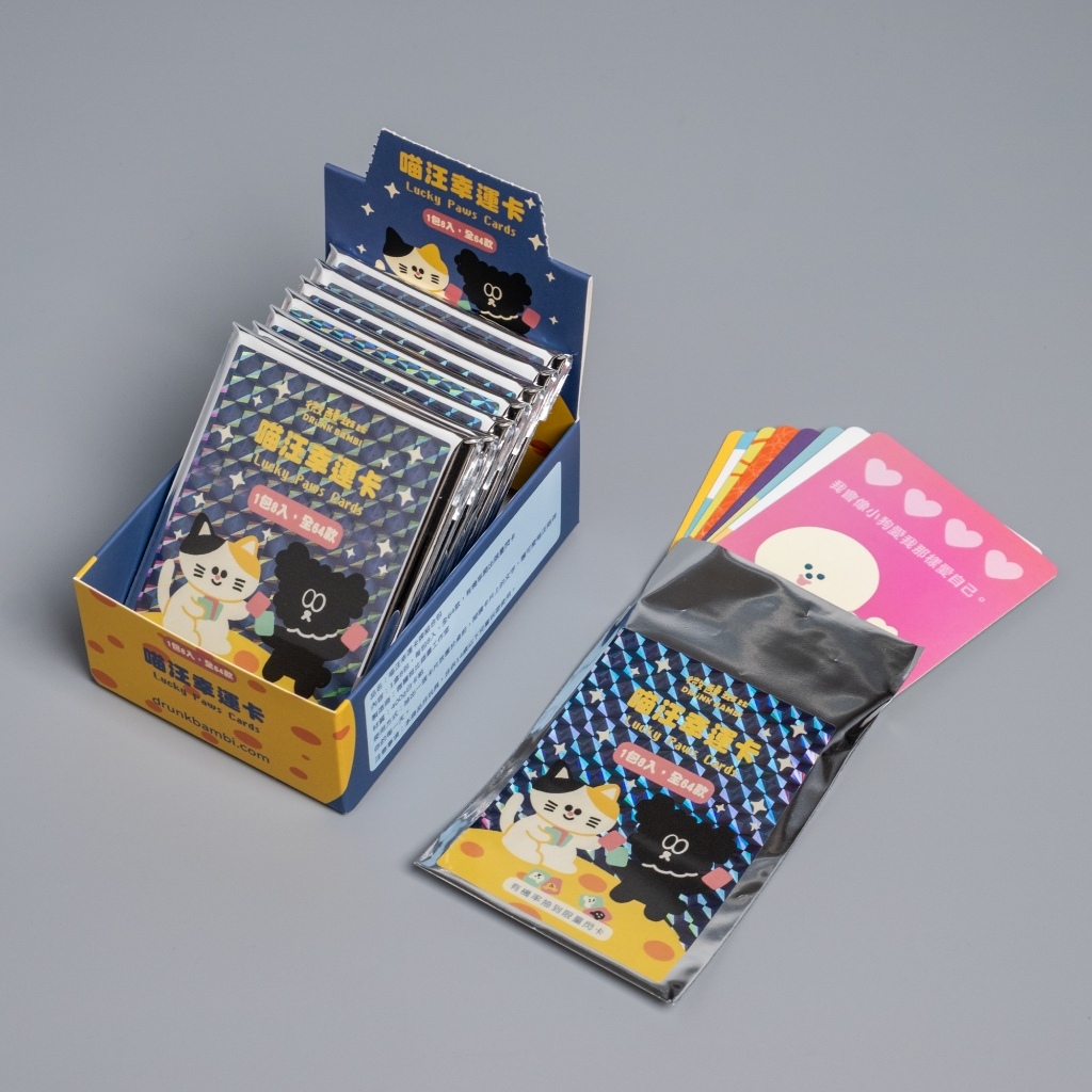 這是一組超可愛的汪喵幸運卡,總共有 64 款設計,每一張都有獨特的內容和角色,