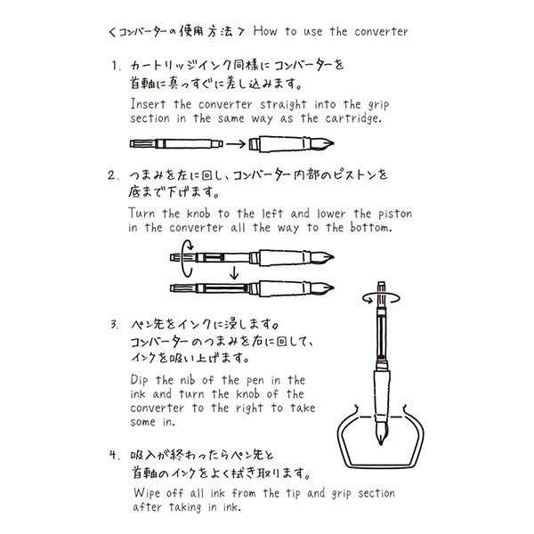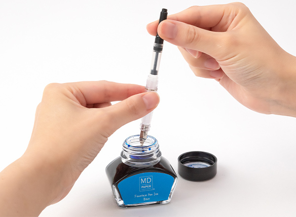 1.將吸墨器筆直插入鋼筆的握筆處(與卡式墨水管相同)。