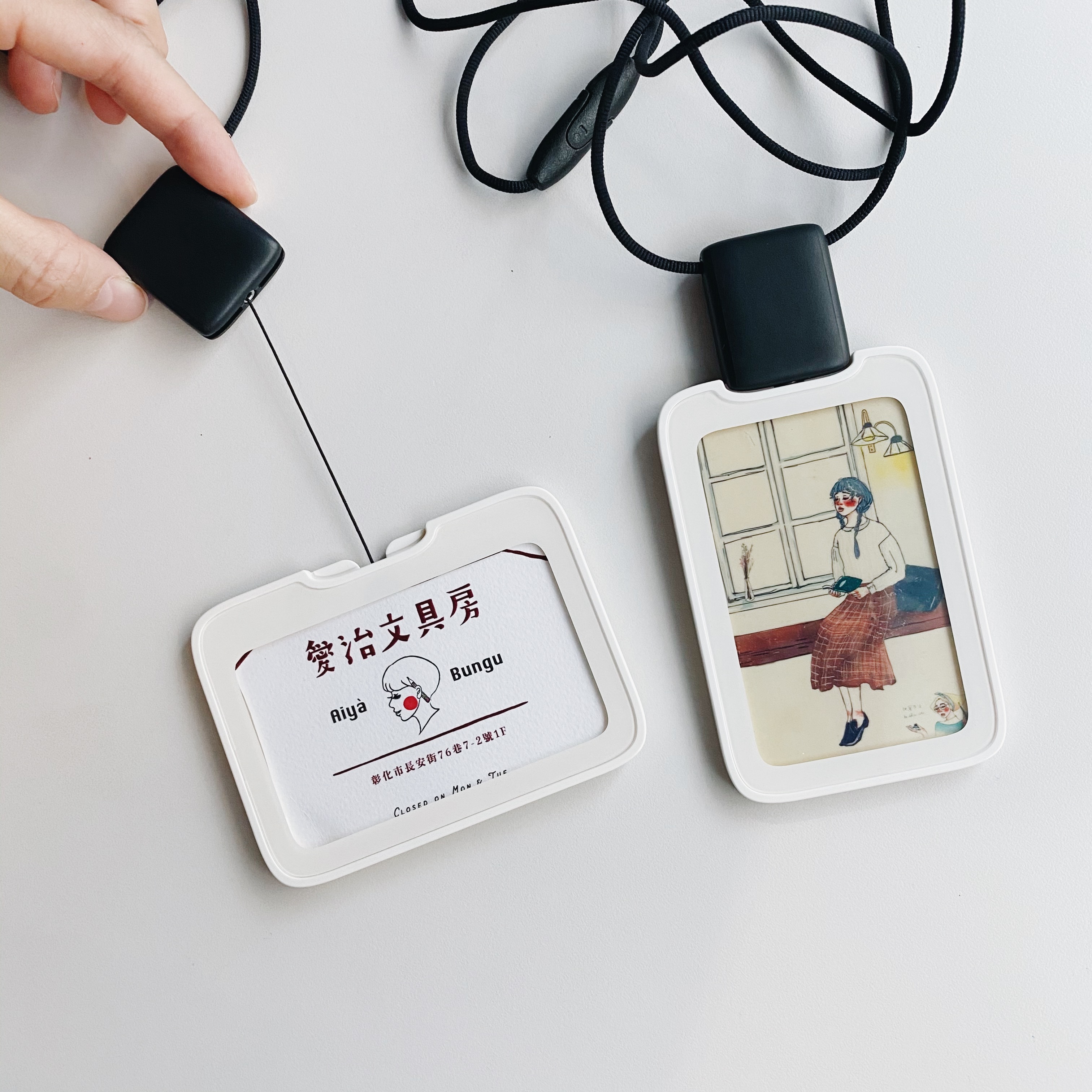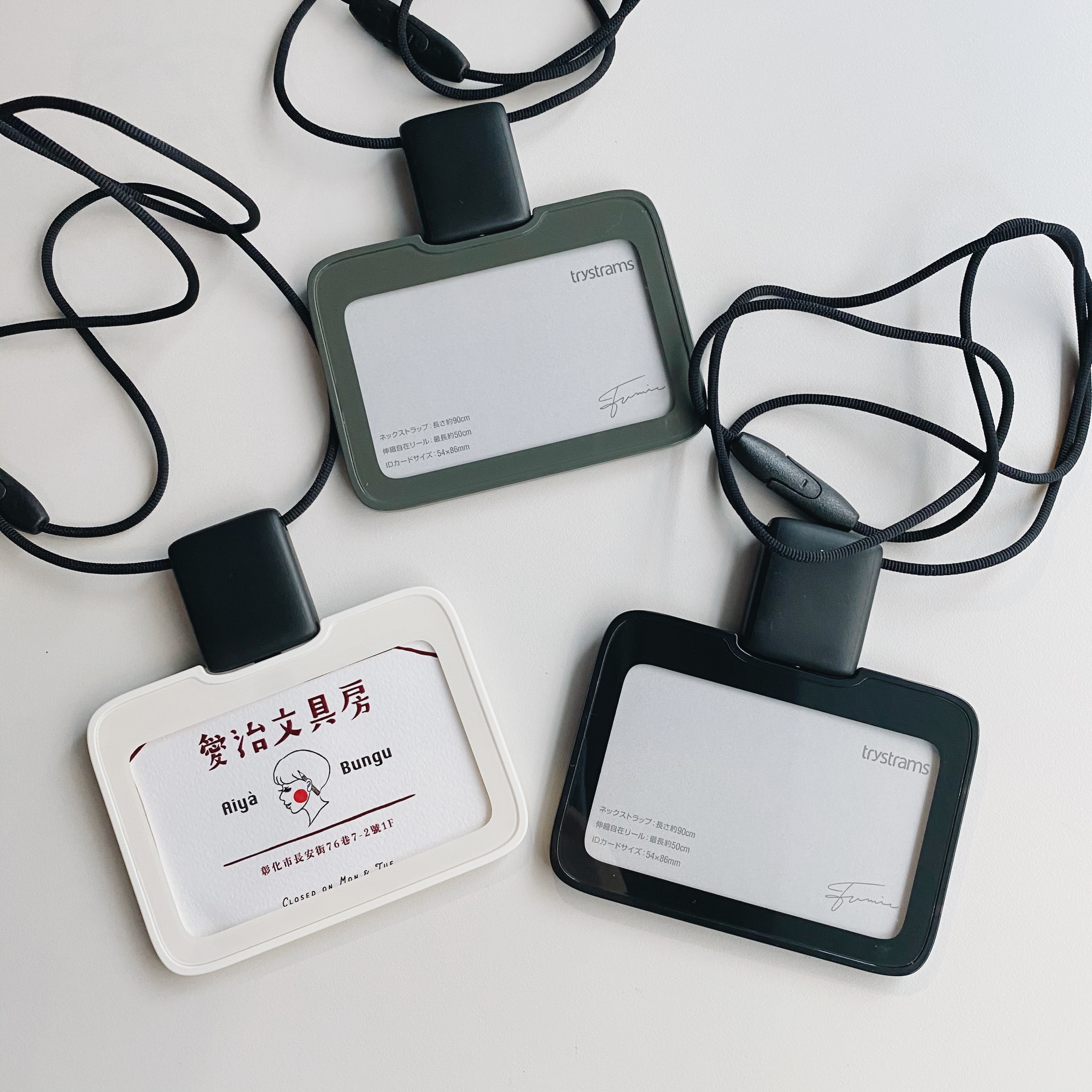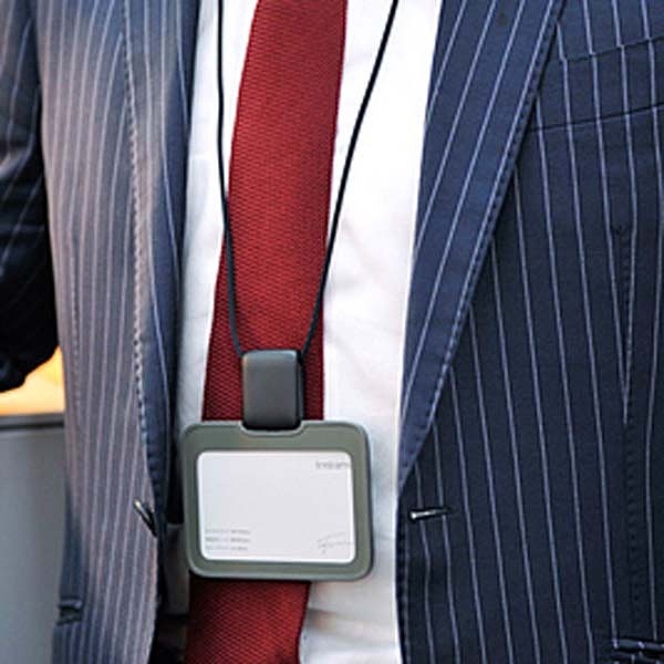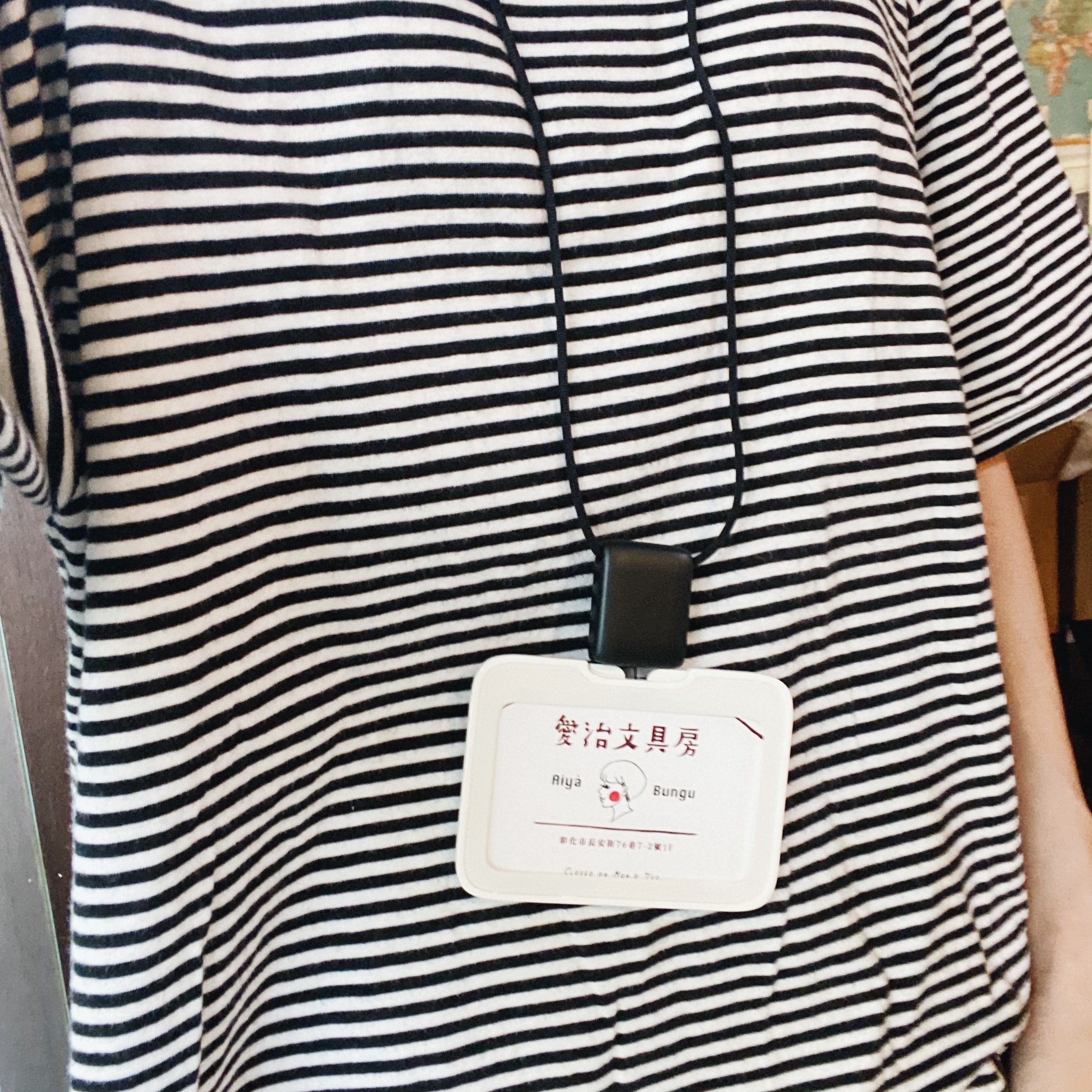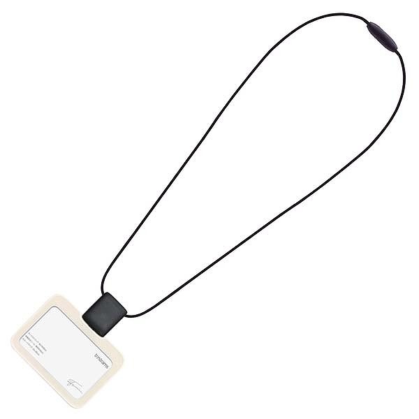 標準的橫式名牌,容易掛在脖子上的簡單頸帶式。