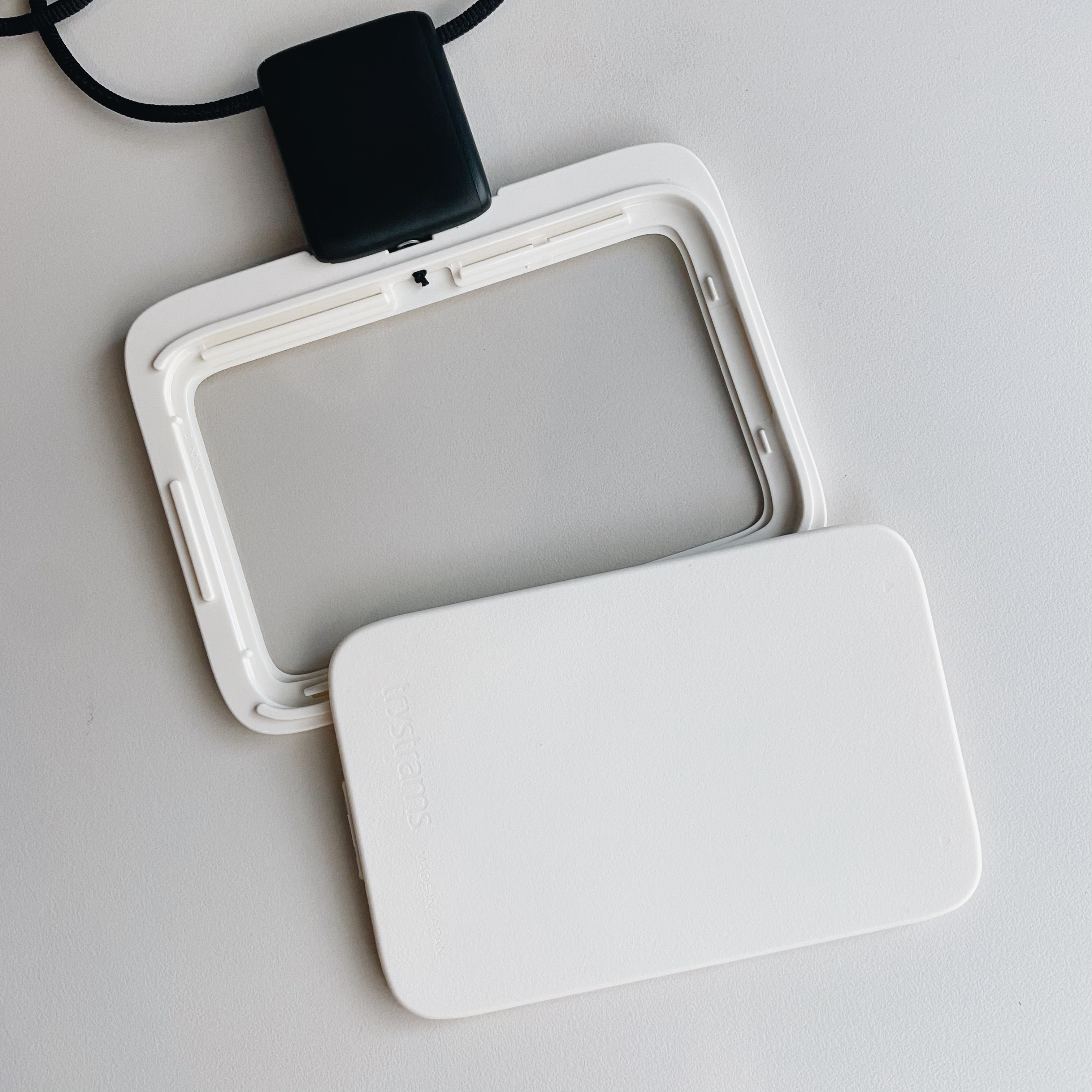 由透明窗和樹脂製成框架打造的質感的薄卡片盒體,進出公司時的員工證、交通卡等。 方便接觸式IC卡的伸縮捲軸,柔性材料製成的後蓋,減少按衣服按鈕時的噪音。